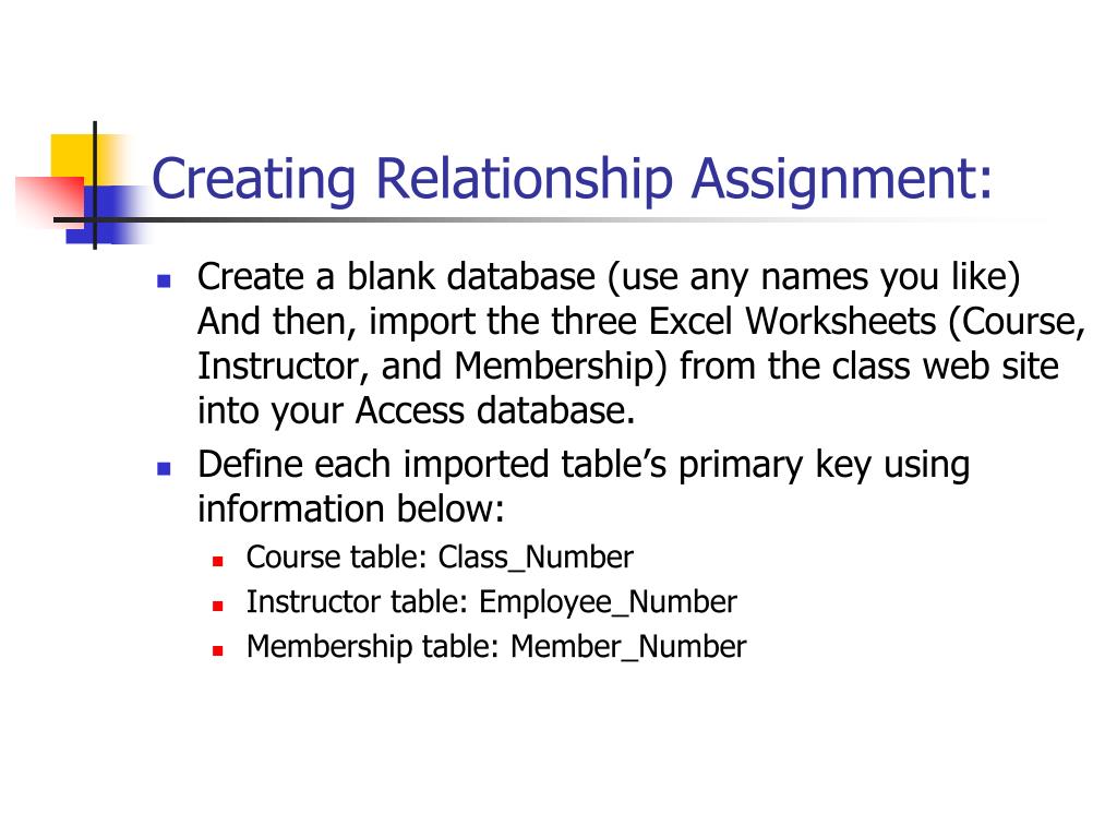 Creating Relationship Assignment: • Create a blank database (use any names you like) And then, import the three Excel Worksheets (Course, Instructor, and Membership) from the class web site into your Access database. • Define each imported table’s primary key using information below: • Course table: Class_Number • Instructor table: Employee_Number • Membership table: Member_Number