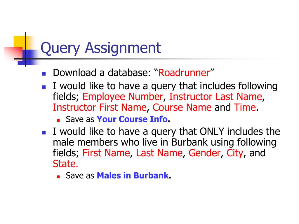 Query Assignment • Download a database: “Roadrunner” • I would like to have a query that includes following fields; Employee Number, Instructor Last Name, Instructor First Name, Course Name and Time. • SaveasYour Course Info. • I would like to have a query that ONLY includes the male members who live in Burbank using following fields; First Name, Last Name, Gender, City, and State. • Save as Males in Burbank.