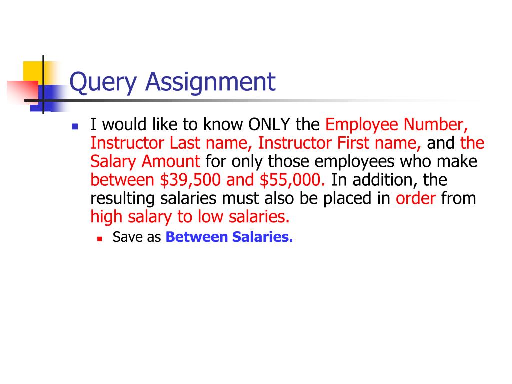 Query Assignment • I would like to know ONLY the Employee Number, Instructor Last name, Instructor First name, and the Salary Amount for only those employees who make between $39,500 and $55,000. In addition, the resulting salaries must also be placed in order from high salary to low salaries. • Save as Between Salaries.