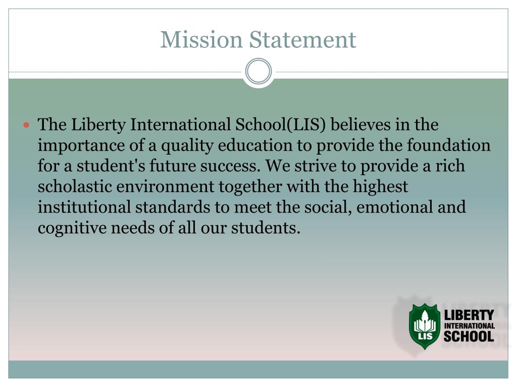 Mission Statement The Liberty International School(LIS) believes in the importance of a quality education to provide the foundation for a student's future success. We strive to provide a rich scholastic environment together with the highest institutional standards to meet the social, emotional and cognitive needs of all our students.