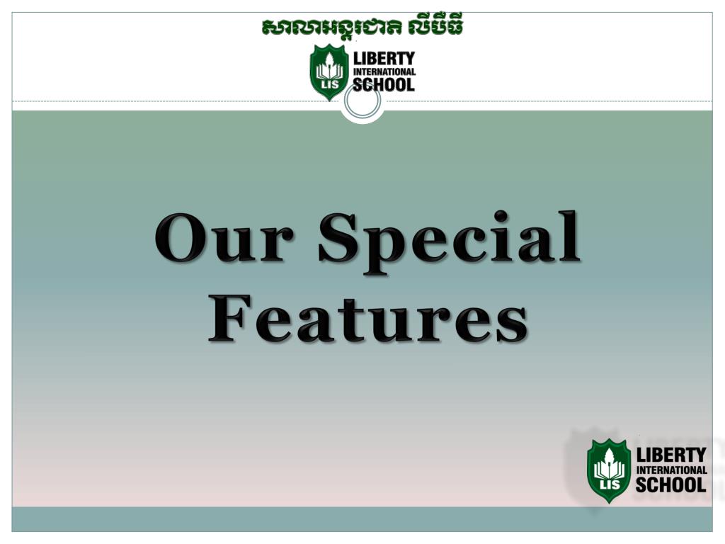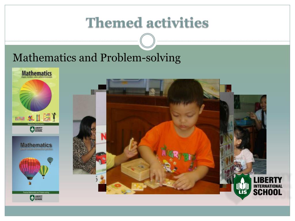 Why Liberty International School? The Early Advantage 1- children who are introduced to a second language early in life will exhibit advanced reading skills 2- a bilingual child typically enjoys the titles of great communicator and excellent problem solver. 3-These skills and attributes typically strengthen independence and contribute to success later in life's journey. 1- modern American-inspired curriculum 2- English is medium of instruction 3- core subjects : English, mathematics, arts and crafts, early science, music, and values 4- qualified foreign teachers