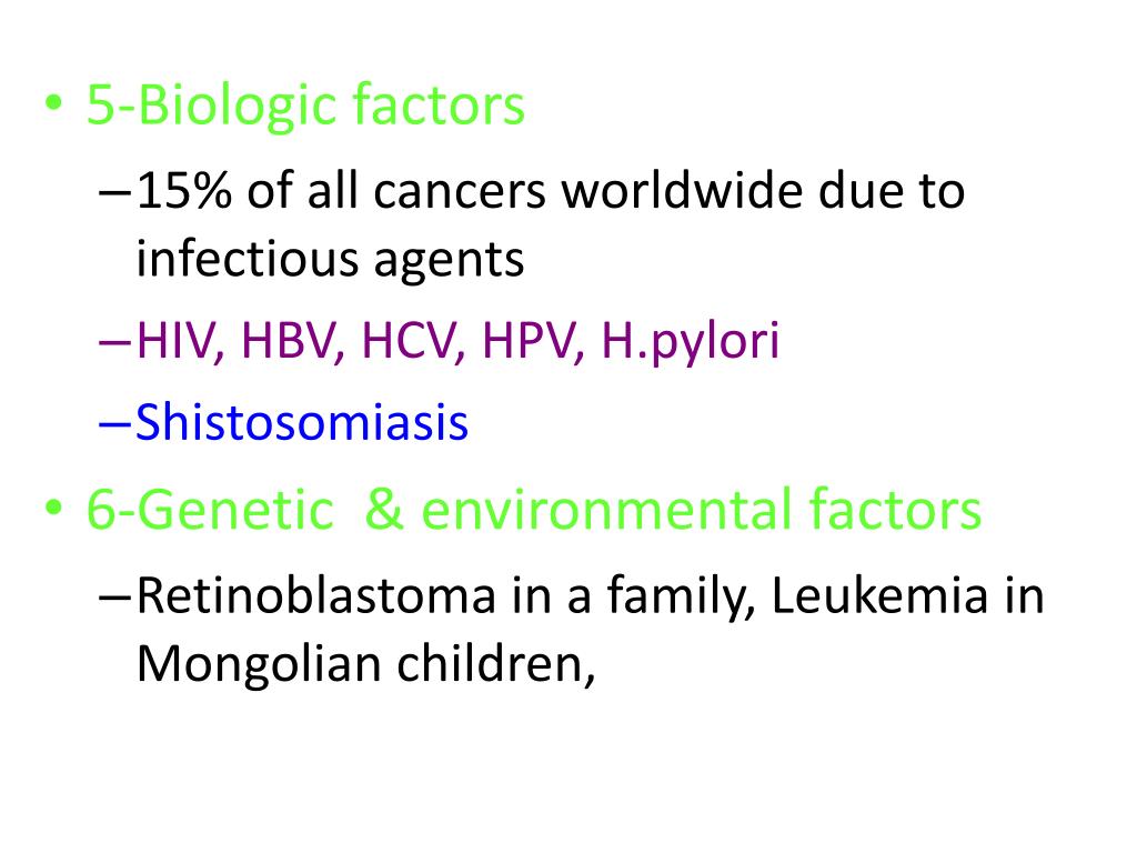 5-Biologic factors • 15% of all cancers worldwide due to infectious agents • HIV, HBV, HCV, HPV, H.pylori • Shistosomiasis • 6-Genetic & environmental factors • Retinoblastoma in a family, Leukemia in Mongolian children,