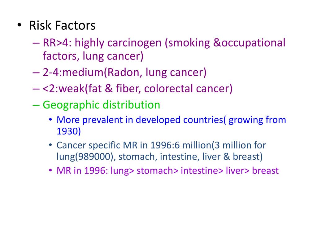 Risk Factors • RR>4: highly carcinogen (smoking &occupational factors, lung cancer) • 2-4:medium(Radon, lung cancer) • <2:weak(fat & fiber, colorectal cancer) • Geographic distribution • More prevalent in developed countries( growing from 1930) • Cancer specific MR in 1996:6 million(3 million for lung(989000), stomach, intestine, liver & breast) • MR in 1996: lung> stomach> intestine> liver> breast