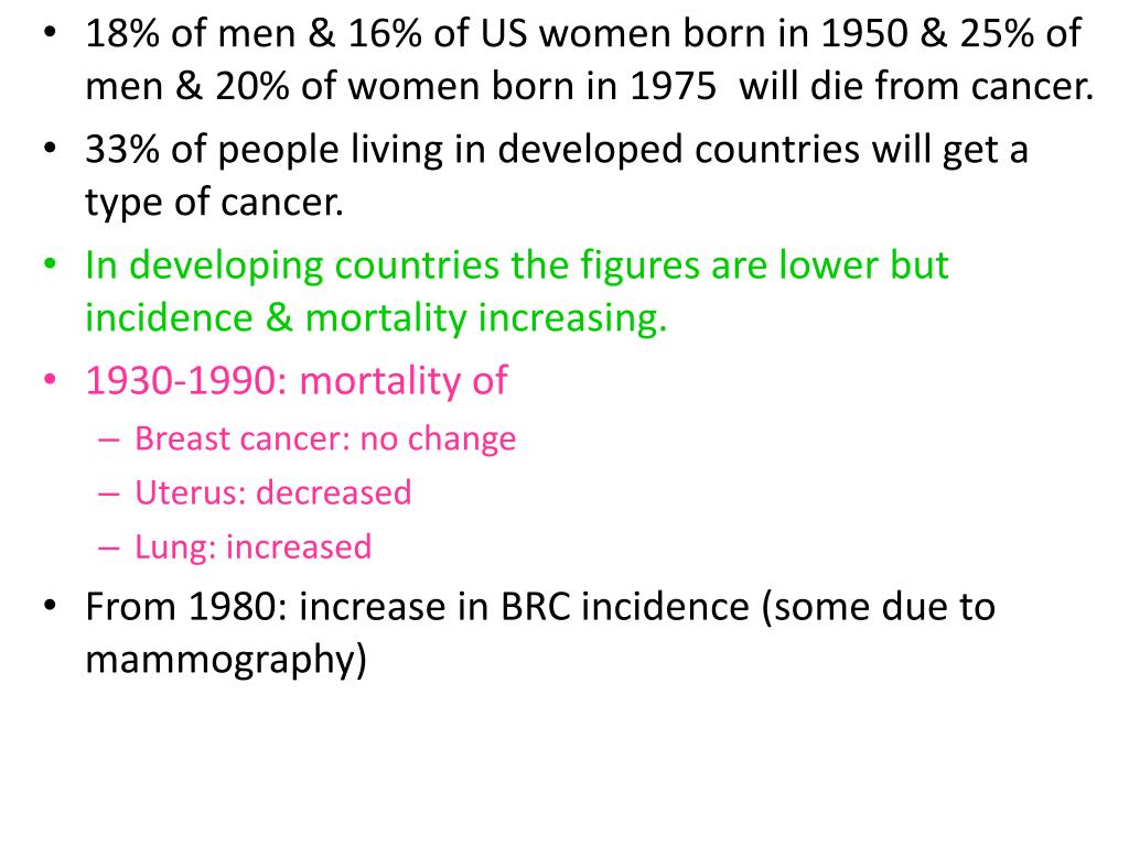 18% of men & 16% of US women born in 1950 & 25% of men & 20% of women born in 1975 will die from cancer. • 33% of people living in developed countries will get a type of cancer. • In developing countries the figures are lower but incidence & mortality increasing. • 1930-1990: mortality of • Breast cancer: no change • Uterus: decreased • Lung: increased • From 1980: increase in BRC incidence (some due to mammography)