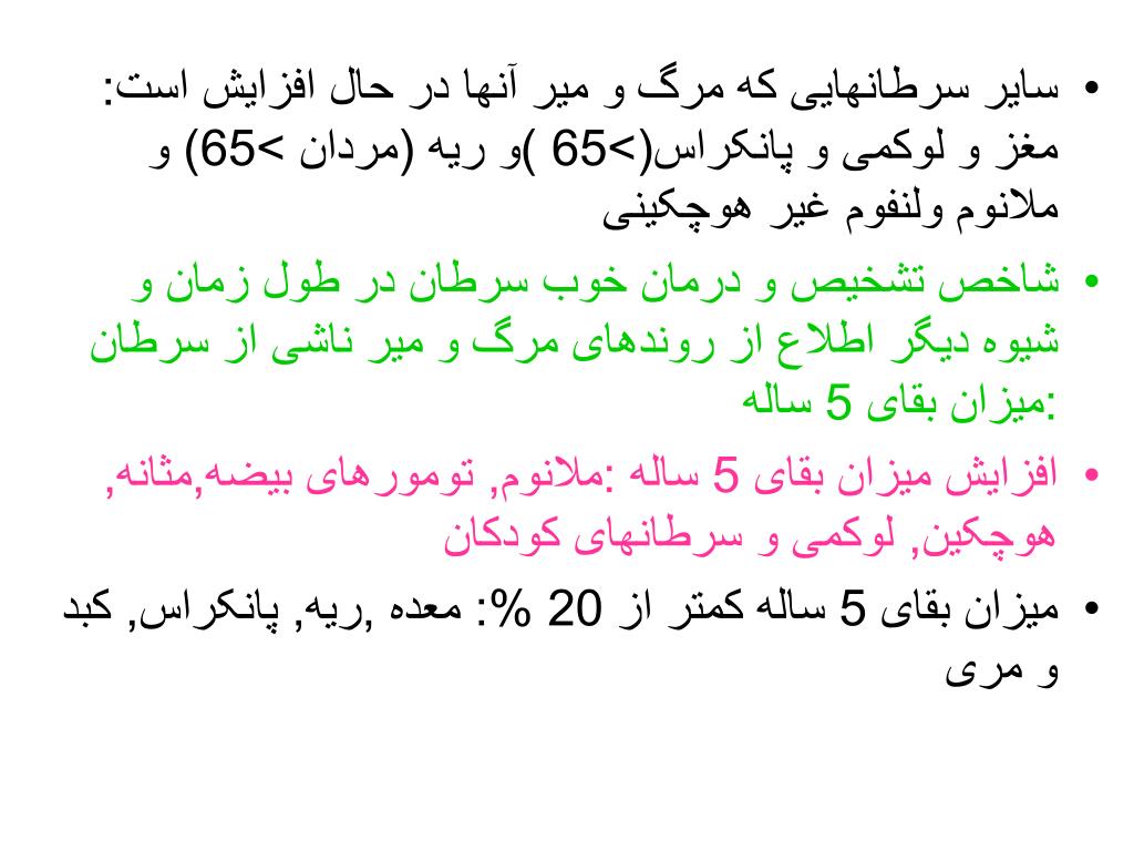 سایر سرطانهایی که مرگ و میر آنها در حال افزایش است: مغز و لوکمی و پانکراس(>65 )و ریه (مردان >65) و ملانوم ولنفوم غیر هوچکینی • شاخص تشخیص و درمان خوب سرطان در طول زمان و شیوه دیگر اطلاع از روندهای مرگ و میر ناشی از سرطان :میزان بقای 5 ساله • افزایش میزان بقای 5 ساله :ملانوم, تومورهای بیضه,مثانه, هوچکین, لوکمی و سرطانهای کودکان • میزان بقای 5 ساله کمتر از 20 %: معده ,ریه, پانکراس, کبد و مری