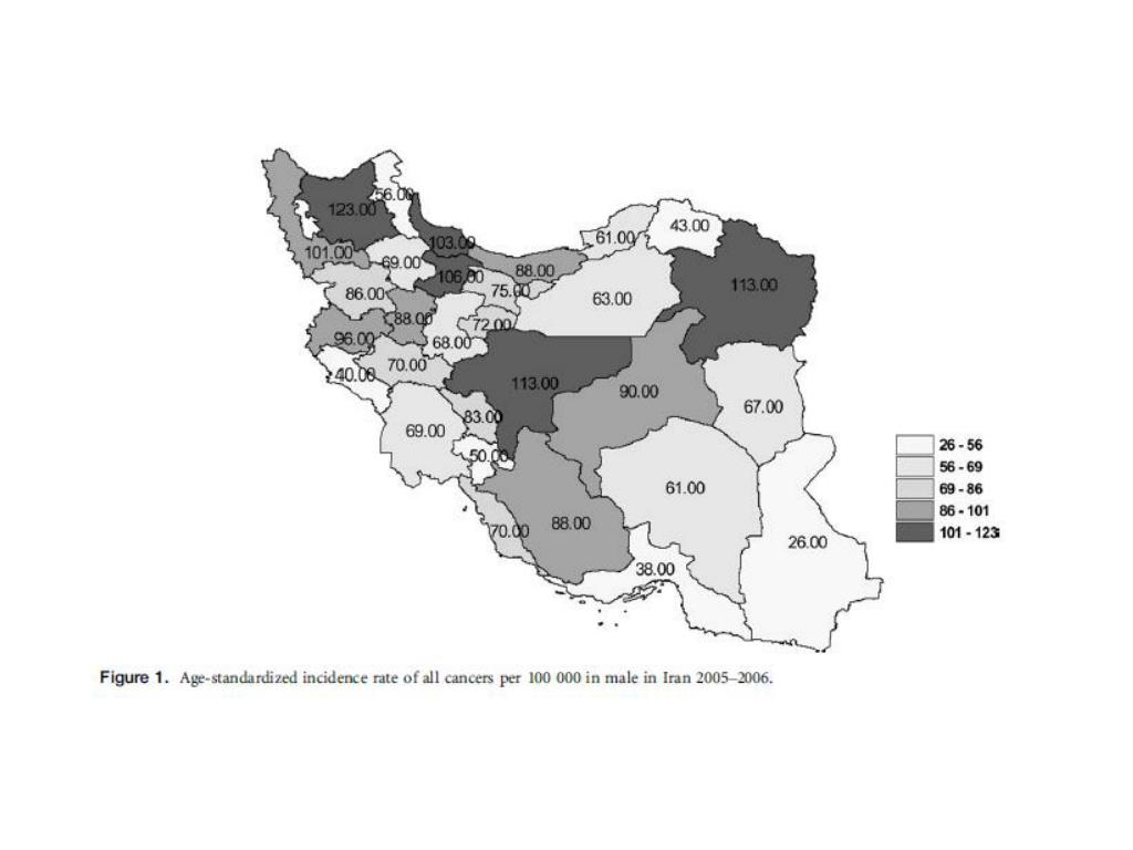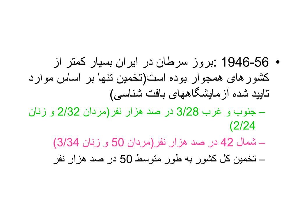 56-1946 :بروز سرطان در ایران بسیار کمتر از کشورهای همجوار بوده است(تخمین تنها بر اساس موارد تایید شده آزمایشگاههای بافت شناسی) • جنوب و غرب 3/28 در صد هزار نفر(مردان 2/32 و زنان 2/24) • شمال 42 در صد هزار نفر(مردان 50 و زنان 3/34) • تخمین کل کشور به طور متوسط 50 در صد هزار نفر