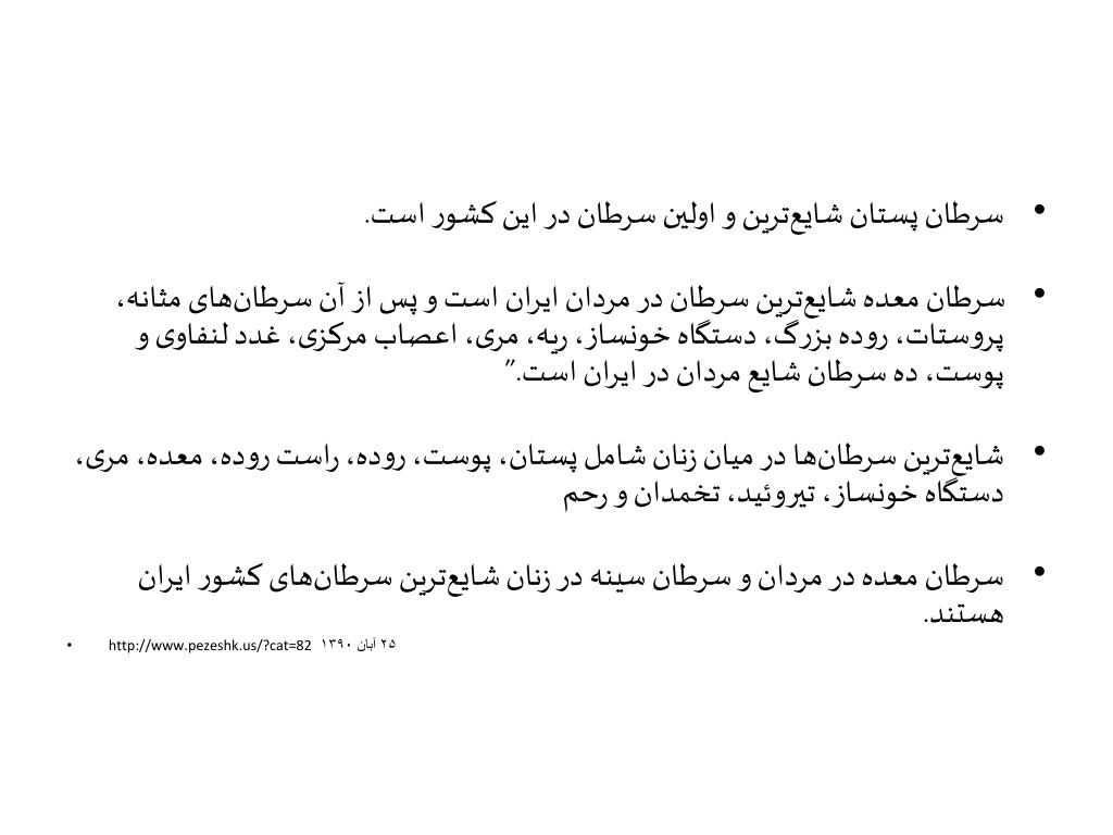 سرطان پستان شایعترین و اولین سرطان در این کشور است. • سرطان معده شایعترین سرطان در مردان ایران است و پس از آن سرطانهای مثانه، پروستات، روده بزرگ، دستگاه خونساز، ریه، مری، اعصاب مرکزی، غدد لنفاوی و پوست، ده سرطان شایع مردان در ایران است.” • شایعترین سرطانها در میان زنان شامل پستان، پوست، روده، راست روده، معده، مری، دستگاه خونساز، تیروئید، تخمدان و رحم • سرطان معده در مردان و سرطان سینه در زنان شایعترین سرطانهای کشور ایران هستند. • http://www.pezeshk.us/?cat=82 ۲۵ آبان ۱۳۹۰