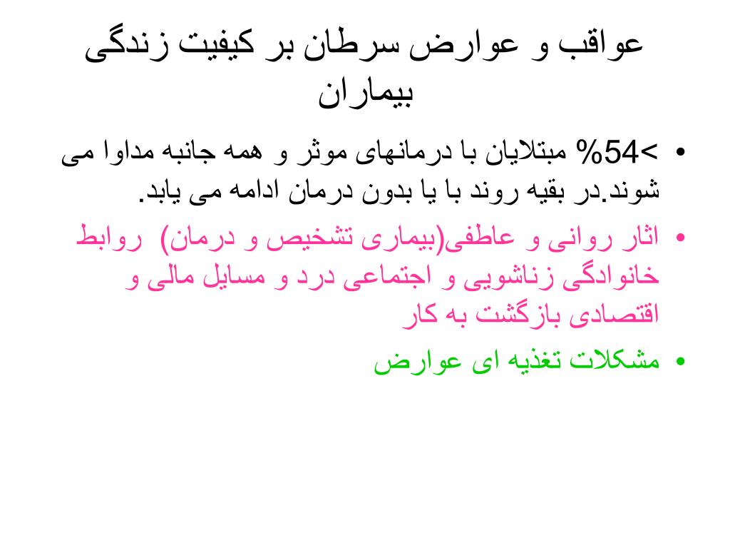 عواقب و عوارض سرطان بر کیفیت زندگی بیماران • >54% مبتلایان با درمانهای موثر و همه جانبه مداوا می شوند.در بقیه روند با یا بدون درمان ادامه می یابد. • اثار روانی و عاطفی(بیماری تشخیص و درمان) روابط خانوادگی زناشویی و اجتماعی درد و مسایل مالی و اقتصادی بازگشت به کار • مشکلات تغذیه ای عوارض