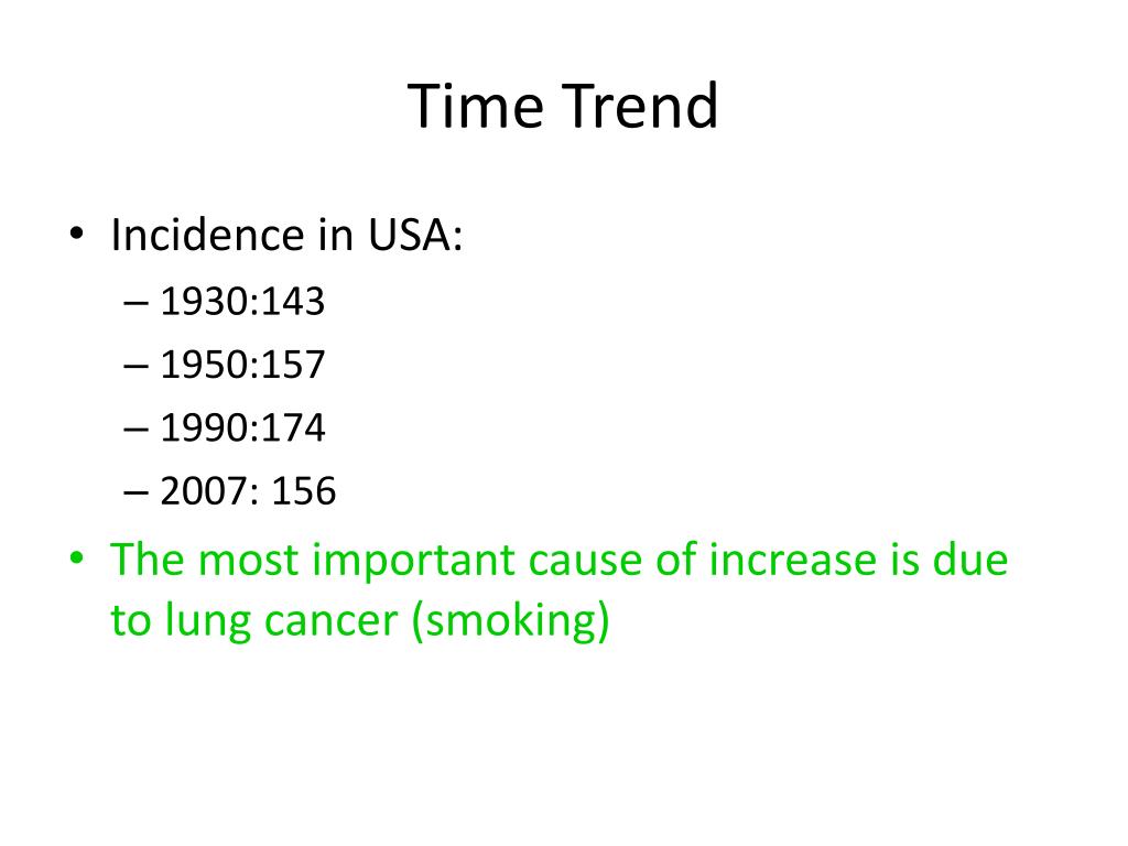 Time Trend • Incidence in USA: • 1930:143 • 1950:157 • 1990:174 • 2007: 156 • The most important cause of increase is due to lung cancer (smoking)