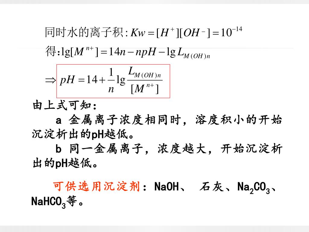 由上式可知: a 金属离子浓度相同时,溶度积小的开始沉淀析出的pH越低。 b 同一金属离子,浓度越大,开始沉淀析出的pH越低。 可供选用沉淀剂:NaOH、 石灰、Na2CO3、 NaHCO3等。