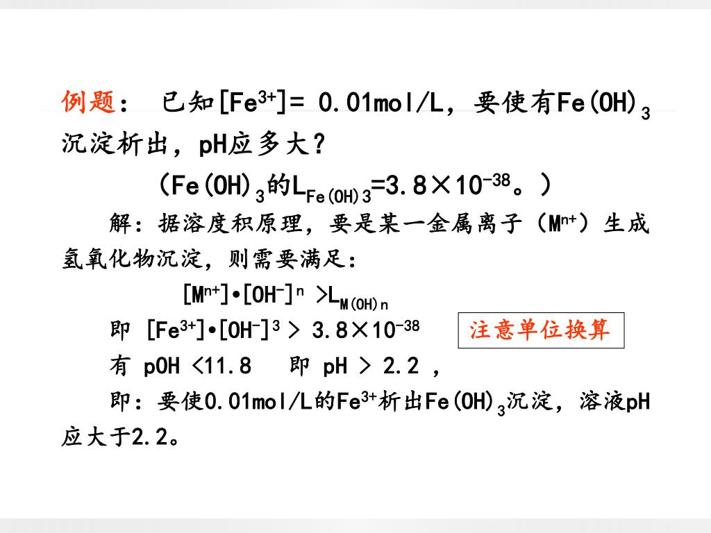 例题: 已知[Fe3+]= 0.01mol/L,要使有Fe(OH)3沉淀析出,pH应多大? (Fe(OH)3的LFe(OH)3=3.8×10-38。) 解:据溶度积原理,要是某一金属离子(Mn+)生成氢氧化物沉淀,则需要满足: [Mn+]•[OH-]n >LM(OH)n 即 [Fe3+]•[OH-]3 > 3.8×10-38 注意单位换算 有 pOH <11.8 即 pH > 2.2 , 即:要使0.01mol/L的Fe3+析出Fe(OH)3沉淀,溶液pH应大于2.2。