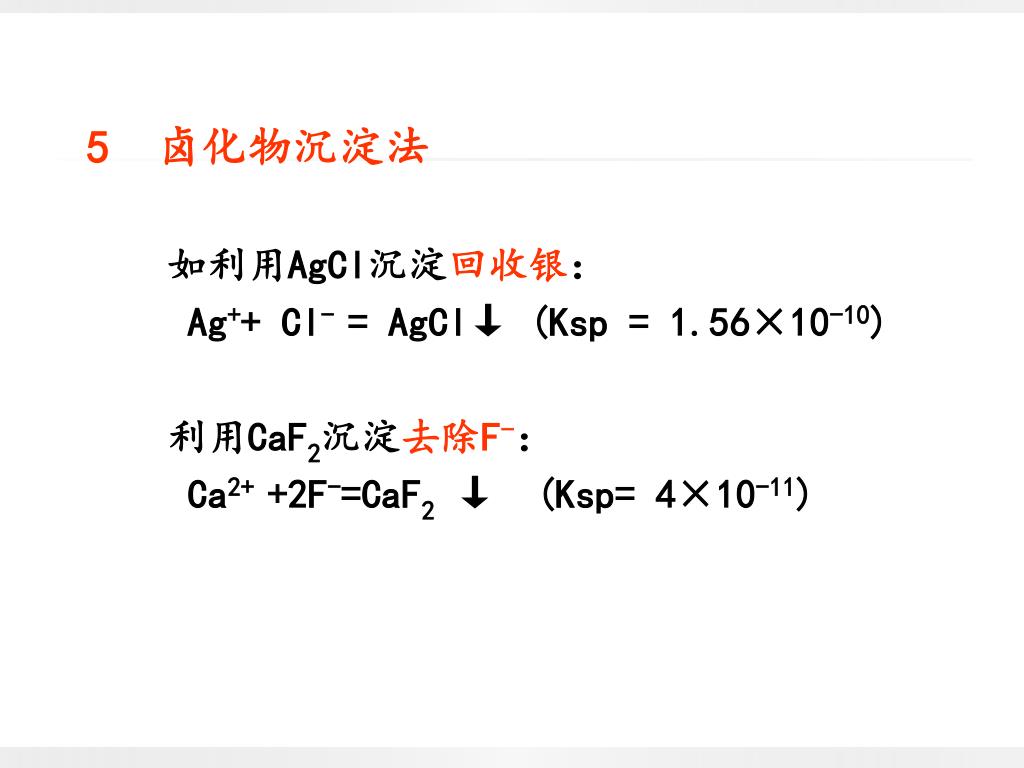 5 卤化物沉淀法 如利用AgCl沉淀回收银: Ag++ Cl- = AgCl↓ (Ksp = 1.56×10-10) 利用CaF2沉淀去除F-: Ca2+ +2F-=CaF2 ↓ (Ksp= 4×10-11)