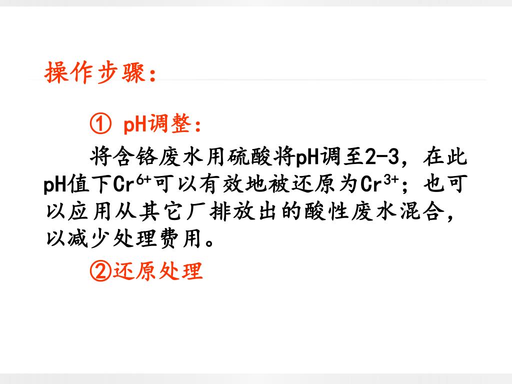 操作步骤: ① pH调整: 将含铬废水用硫酸将pH调至2-3,在此pH值下Cr6+可以有效地被还原为Cr3+;也可以应用从其它厂排放出的酸性废水混合,以减少处理费用。 ②还原处理