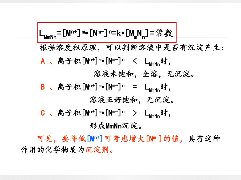 LMmNn=[Mn+]m•[Nm-]n=k•[MmNn]=常数 根据溶度积原理,可以判断溶液中是否有沉淀产生: A 、离子积[Mn+]m•[Nm-]n < LMmNn时, 溶液未饱和,全溶,无沉淀。 B 、离子积[Mn+]m•[Nm-]n = LMmNn时, 溶液正好饱和,无沉淀。 C 、离子积[Mn+]m•[Nm-]n > LMmNn时, 形成MmNn沉淀。 可见,要降低[Mn+]可考虑增大[Nm-]的值,具有这种作用的化学物质为沉淀剂。