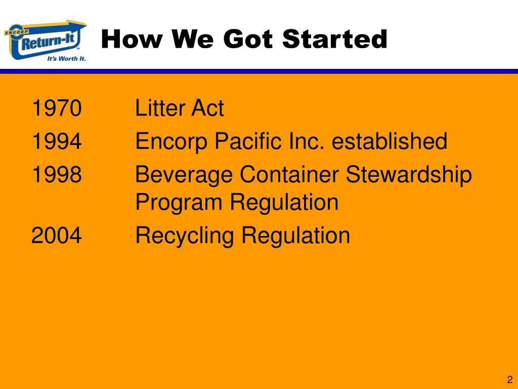 How We Got Started 1970 Litter Act 1994 Encorp Pacific Inc. established 1998 Beverage Container Stewardship Program Regulation 2004 Recycling Regulation