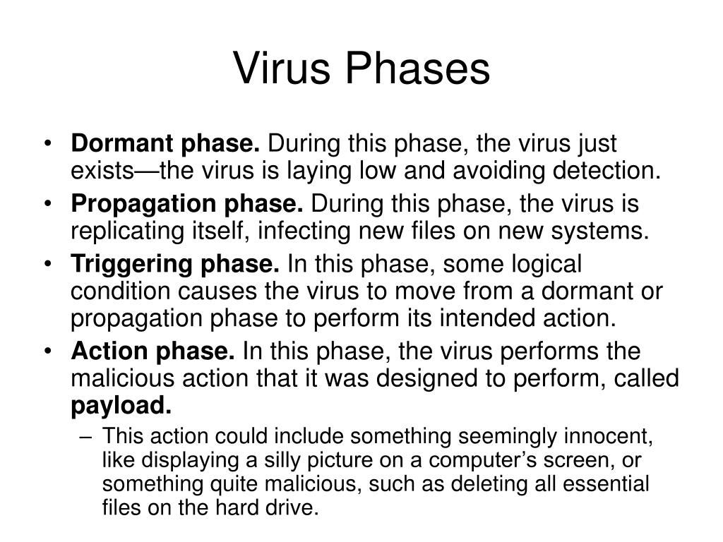 Virus Phases • Dormant phase. During this phase, the virus just exists—the virus is laying low and avoiding detection. • Propagation phase. During this phase, the virus is replicating itself, infecting new files on new systems. • Triggering phase. In this phase, some logical condition causes the virus to move from a dormant or propagation phase to perform its intended action. • Action phase. In this phase, the virus performs the malicious action that it was designed to perform, called payload. • This action could include something seemingly innocent, like displaying a silly picture on a computer’s screen, or something quite malicious, such as deleting all essential files on the hard drive.