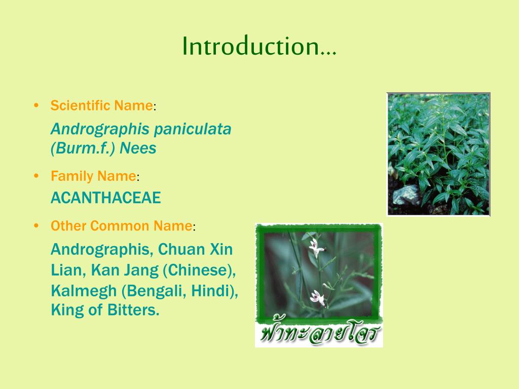 Introduction… • Scientific Name: Andrographis paniculata (Burm.f.) Nees • Family Name: ACANTHACEAE • Other Common Name: Andrographis, Chuan Xin Lian, Kan Jang (Chinese), Kalmegh (Bengali, Hindi), King of Bitters.