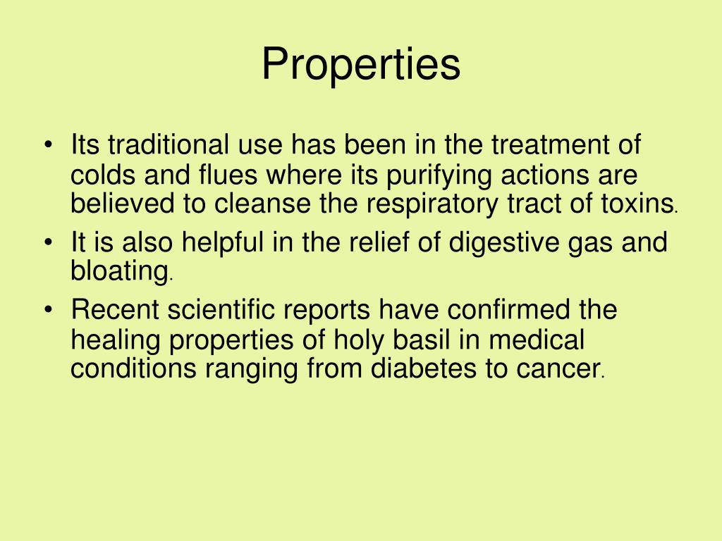 Properties • Its traditional use has been in the treatment of colds and flues where its purifying actions are believed to cleanse the respiratory tract of toxins. • It is also helpful in the relief of digestive gas and bloating. • Recent scientific reports have confirmed the healing properties of holy basil in medical conditions ranging from diabetes to cancer.