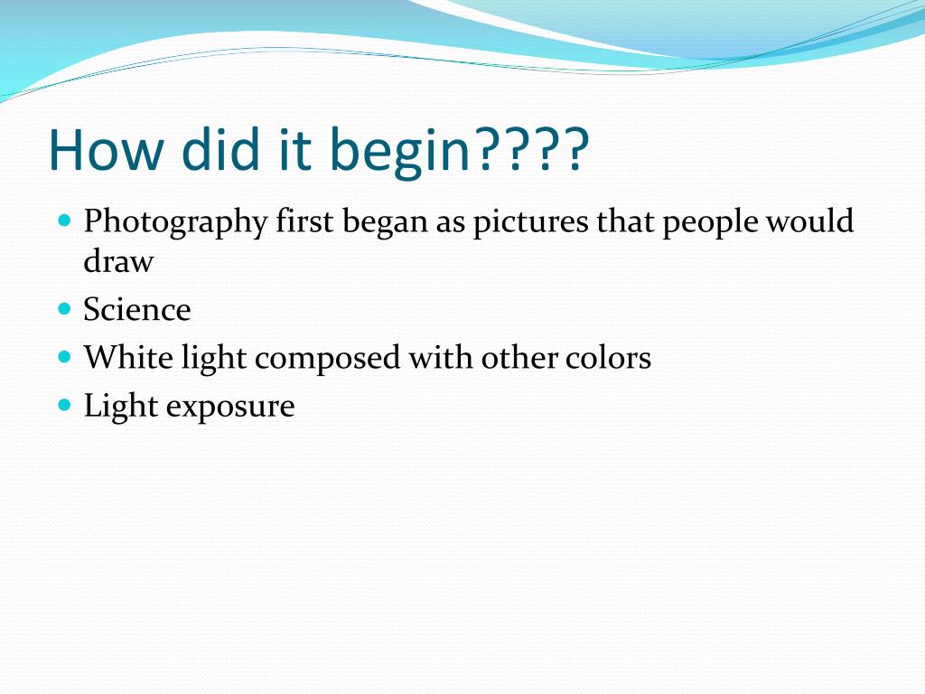 How did it begin???? • Photography first began as pictures that people would draw • Science • White light composed with other colors • Light exposure