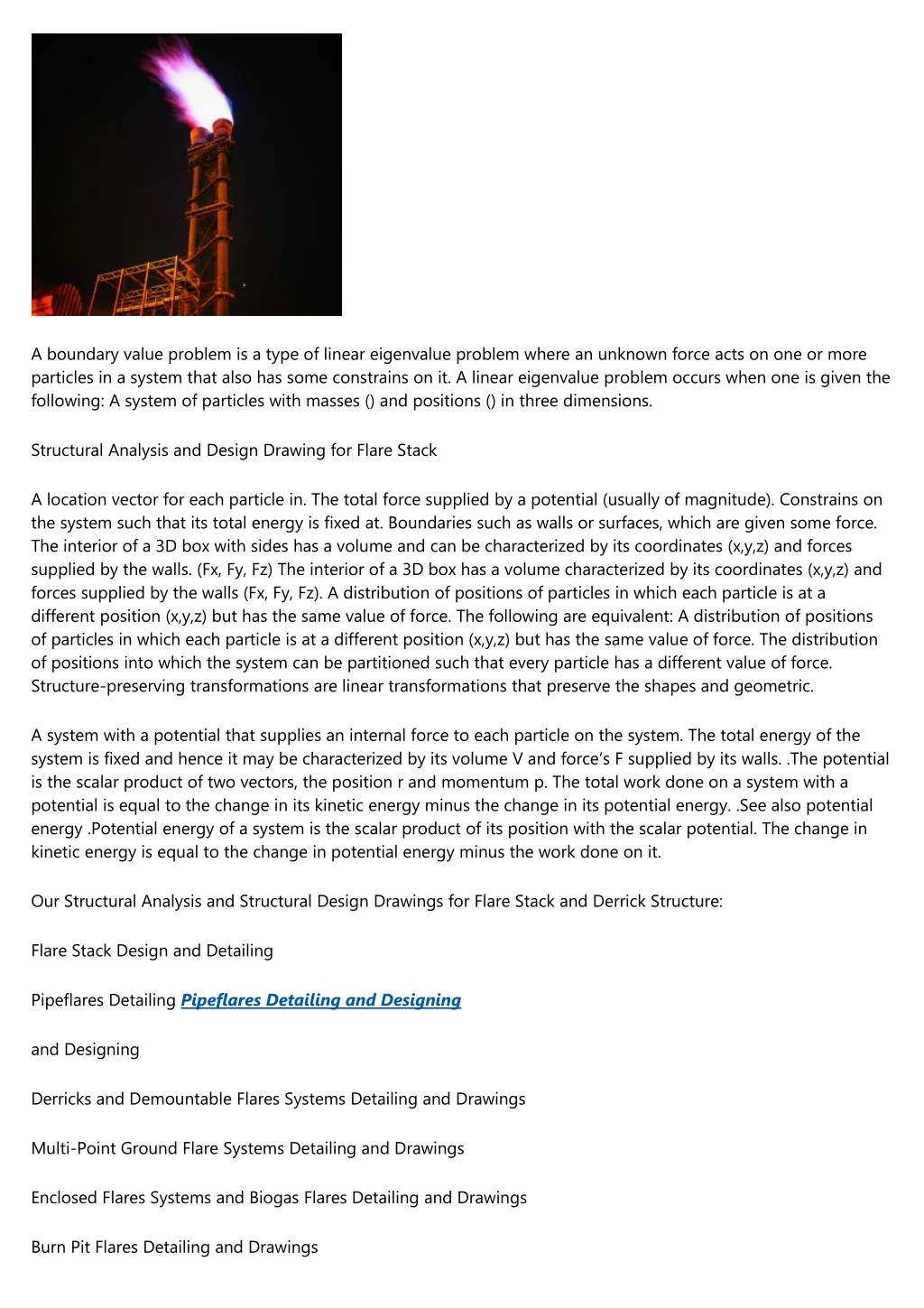 A boundary value problem is a type of linear eigenvalue problem where an unknown force acts on one or more particles in a system that also has some constrains on it. A linear eigenvalue problem occurs when one is given the following: A system of particles with masses () and positions () in three dimensions. Structural Analysis and Design Drawing for Flare Stack A location vector for each particle in. The total force supplied by a potential (usually of magnitude). Constrains on the system such that its total energy is fixed at. Boundaries such as walls or surfaces, which are given some force. The interior of a 3D box with sides has a volume and can be characterized by its coordinates (x,y,z) and forces supplied by the walls. (Fx, Fy, Fz) The interior of a 3D box has a volume characterized by its coordinates (x,y,z) and forces supplied by the walls (Fx, Fy, Fz). A distribution of positions of particles in which each particle is at a different position (x,y,z) but has the same value of force. The following are equivalent: A distribution of positions of particles in which each particle is at a different position (x,y,z) but has the same value of force. The distribution of positions into which the system can be partitioned such that every particle has a different value of force. Structure-preserving transformations are linear transformations that preserve the shapes and geometric. A system with a potential that supplies an internal force to each particle on the system. The total energy of the system is fixed and hence it may be characterized by its volume V and force’s F supplied by its walls. .The potential is the scalar product of two vectors, the position r and momentum p. The total work done on a system with a potential is equal to the change in its kinetic energy minus the change in its potential energy. .See also potential energy .Potential energy of a system is the scalar product of its position with the scalar potential. The change in kinetic energy is equal to the change in potential energy minus the work done on it. Our Structural Analysis and Structural Design Drawings for Flare Stack and Derrick Structure: Flare Stack Design and Detailing Pipeflares Detailing Pipeflares Detailing and Designing and Designing Derricks and Demountable Flares Systems Detailing and Drawings Multi-Point Ground Flare Systems Detailing and Drawings Enclosed Flares Systems and Biogas Flares Detailing and Drawings Burn Pit Flares Detailing and Drawings