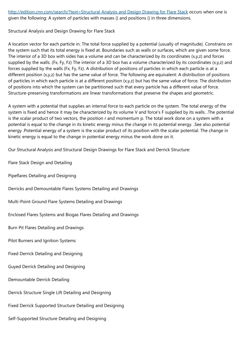 http://edition.cnn.com/search/?text=Structural Analysis and Design Drawing for Flare Stack occurs when one is given the following: A system of particles with masses () and positions () in three dimensions. Structural Analysis and Design Drawing for Flare Stack A location vector for each particle in. The total force supplied by a potential (usually of magnitude). Constrains on the system such that its total energy is fixed at. Boundaries such as walls or surfaces, which are given some force. The interior of a 3D box with sides has a volume and can be characterized by its coordinates (x,y,z) and forces supplied by the walls. (Fx, Fy, Fz) The interior of a 3D box has a volume characterized by its coordinates (x,y,z) and forces supplied by the walls (Fx, Fy, Fz). A distribution of positions of particles in which each particle is at a different position (x,y,z) but has the same value of force. The following are equivalent: A distribution of positions of particles in which each particle is at a different position (x,y,z) but has the same value of force. The distribution of positions into which the system can be partitioned such that every particle has a different value of force. Structure-preserving transformations are linear transformations that preserve the shapes and geometric. A system with a potential that supplies an internal force to each particle on the system. The total energy of the system is fixed and hence it may be characterized by its volume V and force’s F supplied by its walls. .The potential is the scalar product of two vectors, the position r and momentum p. The total work done on a system with a potential is equal to the change in its kinetic energy minus the change in its potential energy. .See also potential energy .Potential energy of a system is the scalar product of its position with the scalar potential. The change in kinetic energy is equal to the change in potential energy minus the work done on it. Our Structural Analysis and Structural Design Drawings for Flare Stack and Derrick Structure: Flare Stack Design and Detailing Pipeflares Detailing and Designing Derricks and Demountable Flares Systems Detailing and Drawings Multi-Point Ground Flare Systems Detailing and Drawings Enclosed Flares Systems and Biogas Flares Detailing and Drawings Burn Pit Flares Detailing and Drawings Pilot Burners and Ignition Systems Fixed Derrick Detailing and Designing Guyed Derrick Detailing and Designing Demountable Derrick Detailing Derrick Structure Single Lift Detailing and Designing Fixed Derrick Supported Structure Detailing and Designing Self-Supported Structure Detailing and Designing
