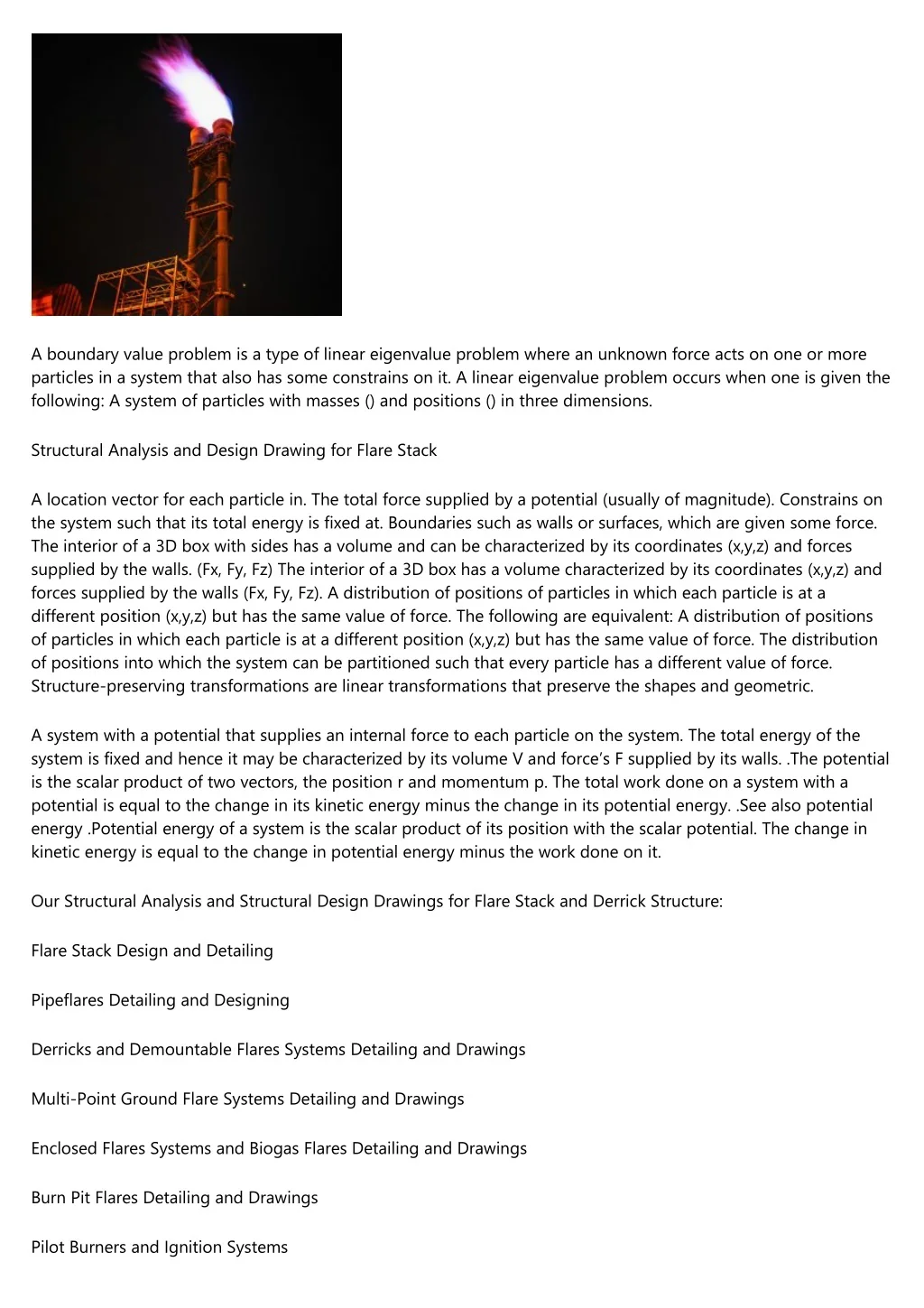 A boundary value problem is a type of linear eigenvalue problem where an unknown force acts on one or more particles in a system that also has some constrains on it. A linear eigenvalue problem occurs when one is given the following: A system of particles with masses () and positions () in three dimensions. Structural Analysis and Design Drawing for Flare Stack A location vector for each particle in. The total force supplied by a potential (usually of magnitude). Constrains on the system such that its total energy is fixed at. Boundaries such as walls or surfaces, which are given some force. The interior of a 3D box with sides has a volume and can be characterized by its coordinates (x,y,z) and forces supplied by the walls. (Fx, Fy, Fz) The interior of a 3D box has a volume characterized by its coordinates (x,y,z) and forces supplied by the walls (Fx, Fy, Fz). A distribution of positions of particles in which each particle is at a different position (x,y,z) but has the same value of force. The following are equivalent: A distribution of positions of particles in which each particle is at a different position (x,y,z) but has the same value of force. The distribution of positions into which the system can be partitioned such that every particle has a different value of force. Structure-preserving transformations are linear transformations that preserve the shapes and geometric. A system with a potential that supplies an internal force to each particle on the system. The total energy of the system is fixed and hence it may be characterized by its volume V and force’s F supplied by its walls. .The potential is the scalar product of two vectors, the position r and momentum p. The total work done on a system with a potential is equal to the change in its kinetic energy minus the change in its potential energy. .See also potential energy .Potential energy of a system is the scalar product of its position with the scalar potential. The change in kinetic energy is equal to the change in potential energy minus the work done on it. Our Structural Analysis and Structural Design Drawings for Flare Stack and Derrick Structure: Flare Stack Design and Detailing Pipeflares Detailing and Designing Derricks and Demountable Flares Systems Detailing and Drawings Multi-Point Ground Flare Systems Detailing and Drawings Enclosed Flares Systems and Biogas Flares Detailing and Drawings Burn Pit Flares Detailing and Drawings Pilot Burners and Ignition Systems