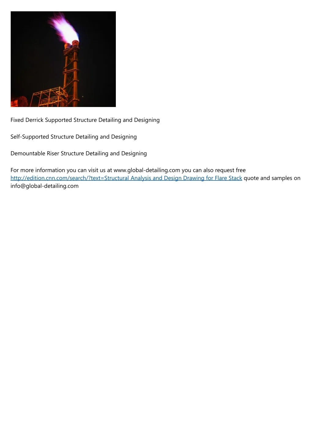 Fixed Derrick Supported Structure Detailing and Designing Self-Supported Structure Detailing and Designing Demountable Riser Structure Detailing and Designing For more information you can visit us at www.global-detailing.com you can also request free http://edition.cnn.com/search/?text=Structural Analysis and Design Drawing for Flare Stack quote and samples on info@global-detailing.com