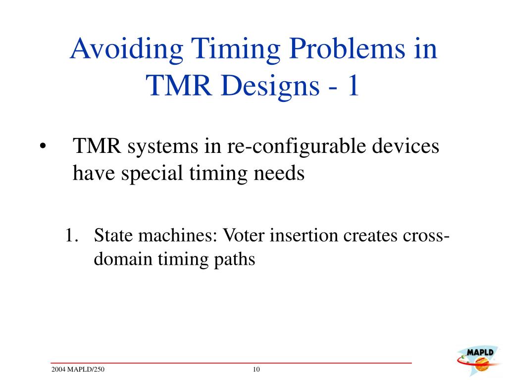 Avoiding Timing Problems in TMR Designs - 1 • TMR systems in re-configurable devices have special timing needs • State machines: Voter insertion creates cross-domain timing paths