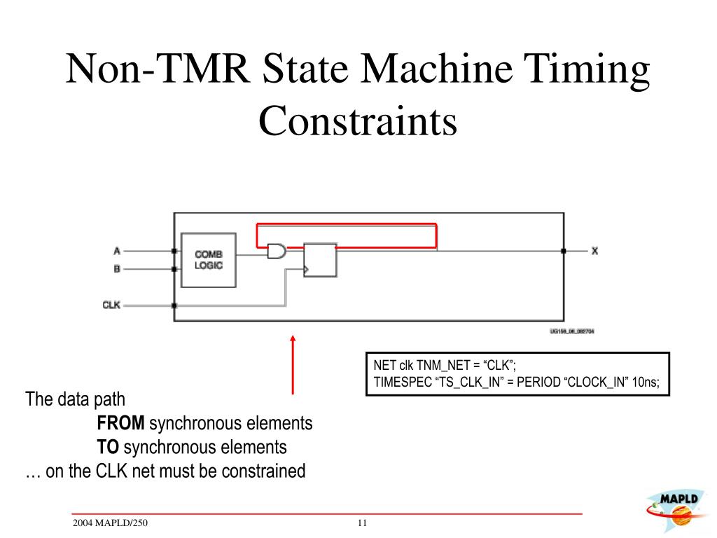 Non-TMR State Machine Timing Constraints NET clk TNM_NET = “CLK”; TIMESPEC “TS_CLK_IN” = PERIOD “CLOCK_IN” 10ns; The data path FROM synchronous elements TO synchronous elements … on the CLK net must be constrained
