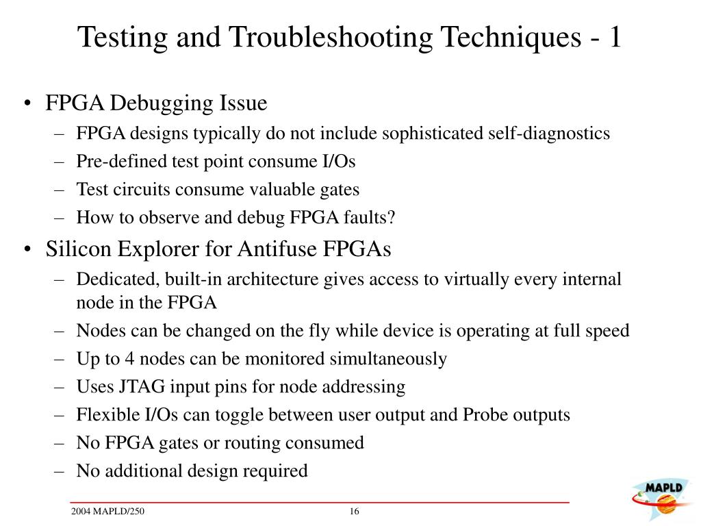 Testing and Troubleshooting Techniques - 1 • FPGA Debugging Issue • FPGA designs typically do not include sophisticated self-diagnostics • Pre-defined test point consume I/Os • Test circuits consume valuable gates • How to observe and debug FPGA faults? • Silicon Explorer for Antifuse FPGAs • Dedicated, built-in architecture gives access to virtually every internal node in the FPGA • Nodes can be changed on the fly while device is operating at full speed • Up to 4 nodes can be monitored simultaneously • Uses JTAG input pins for node addressing • Flexible I/Os can toggle between user output and Probe outputs • No FPGA gates or routing consumed • No additional design required