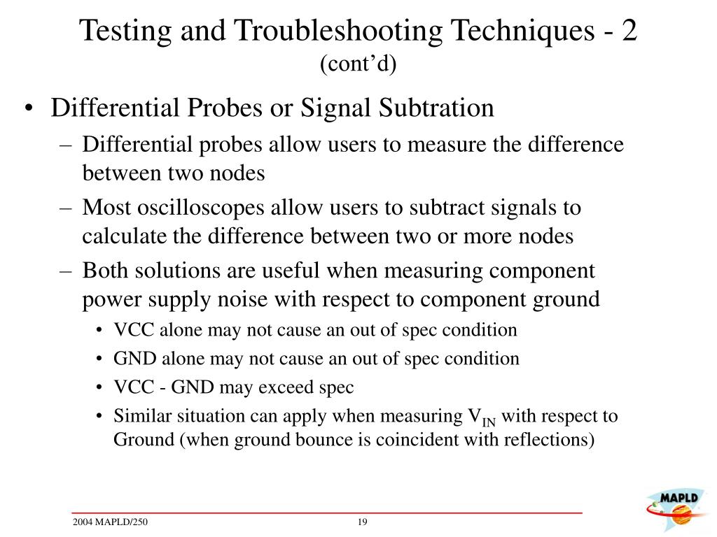 Testing and Troubleshooting Techniques - 2(cont’d) • Differential Probes or Signal Subtration • Differential probes allow users to measure the difference between two nodes • Most oscilloscopes allow users to subtract signals to calculate the difference between two or more nodes • Both solutions are useful when measuring component power supply noise with respect to component ground • VCC alone may not cause an out of spec condition • GND alone may not cause an out of spec condition • VCC - GND may exceed spec • Similar situation can apply when measuring VIN with respect to Ground (when ground bounce is coincident with reflections)