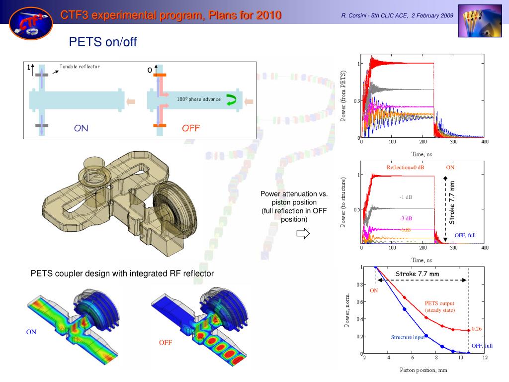 PETS on/off • Remarks: • High power tests of components and concept validation (slow movement, external reflector) will be done in 2010 in the TBTS PETS. • Meanwhile, the 25% power reduction can be tested this spring at SLAC with the new PETS (under construction). • The fast (~ 10-15 ms), vacuum compatible linear actuator prototype should be ready for testing in TBTS by mid 2010.