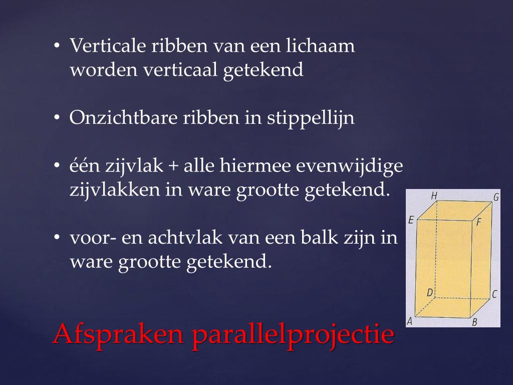 Verticale ribben van een lichaam worden verticaal getekend • Onzichtbare ribben in stippellijn • één zijvlak + alle hiermee evenwijdige zijvlakken in ware grootte getekend. • voor- en achtvlak van een balk zijn in ware grootte getekend. Afspraken parallelprojectie