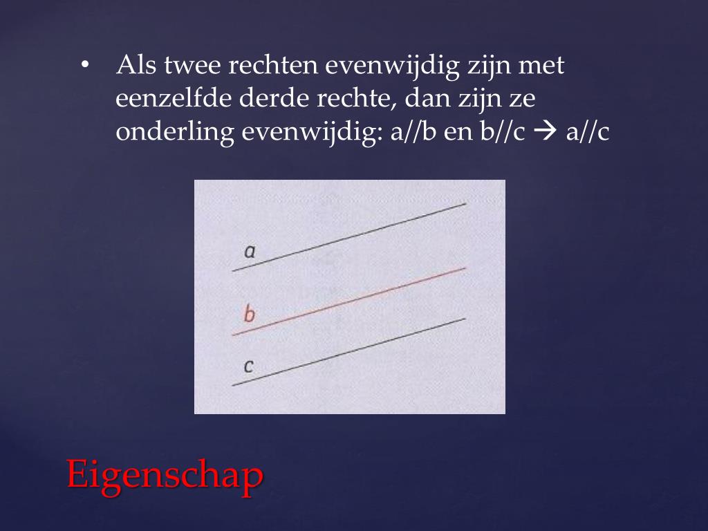 Als twee rechten evenwijdig zijn met eenzelfde derde rechte, dan zijn ze onderling evenwijdig: a//b en b//c a//c Eigenschap