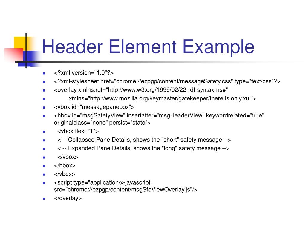 Header Element Example • <?xml version="1.0"?> • <?xml-stylesheet href="chrome://ezpgp/content/messageSafety.css" type="text/css"?> • <overlay xmlns:rdf="http://www.w3.org/1999/02/22-rdf-syntax-ns#" • xmlns="http://www.mozilla.org/keymaster/gatekeeper/there.is.only.xul"> • <vbox id="messagepanebox"> • <hbox id="msgSafetyView" insertafter="msgHeaderView" keywordrelated="true" originalclass="none" persist="state"> • <vbox flex="1"> • <!-- Collapsed Pane Details, shows the "short" safety message --> • <!-- Expanded Pane Details, shows the "long" safety message --> • </vbox> • </hbox> • </vbox> • <script type="application/x-javascript" src="chrome://ezpgp/content/msgSfeViewOverlay.js"/> • </overlay>