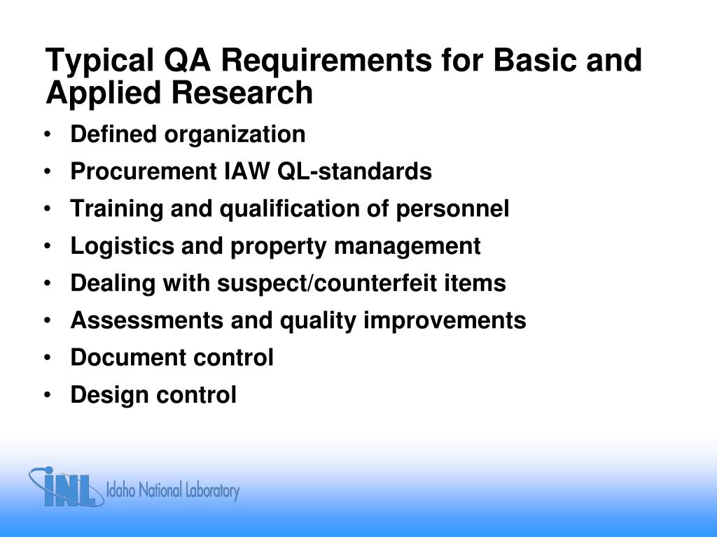 Typical QA Requirements for Basic and Applied Research • Defined organization • Procurement IAW QL-standards • Training and qualification of personnel • Logistics and property management • Dealing with suspect/counterfeit items • Assessments and quality improvements • Document control • Design control