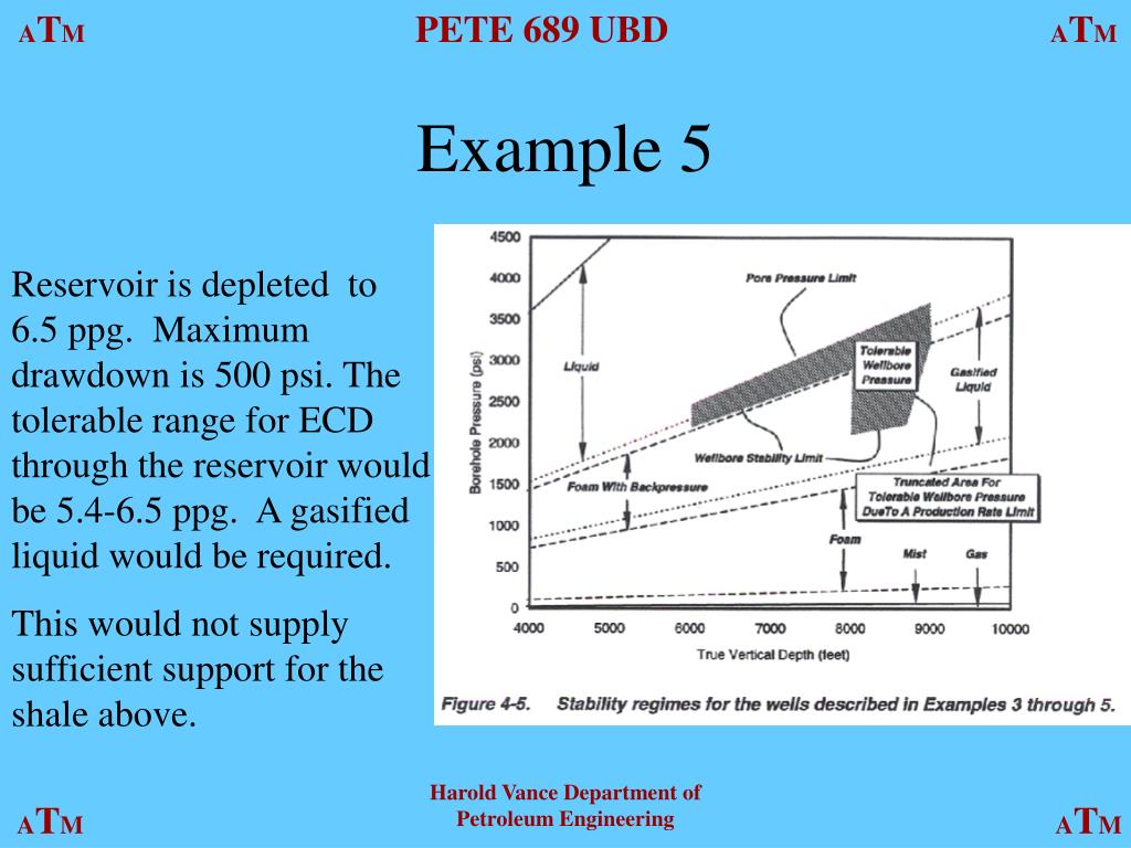 Example 5 Reservoir is depleted to 6.5 ppg. Maximum drawdown is 500 psi. The tolerable range for ECD through the reservoir would be 5.4-6.5 ppg. A gasified liquid would be required. This would not supply sufficient support for the shale above. Harold Vance Department of Petroleum Engineering