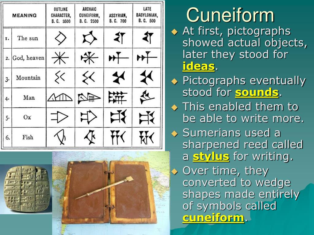 Cuneiform • At first, pictographs showed actual objects, later they stood for ideas. • Pictographs eventually stood for sounds. • This enabled them to be able to write more. • Sumerians used a sharpened reed called a stylus for writing. • Over time, they converted to wedge shapes made entirely of symbols called cuneiform.