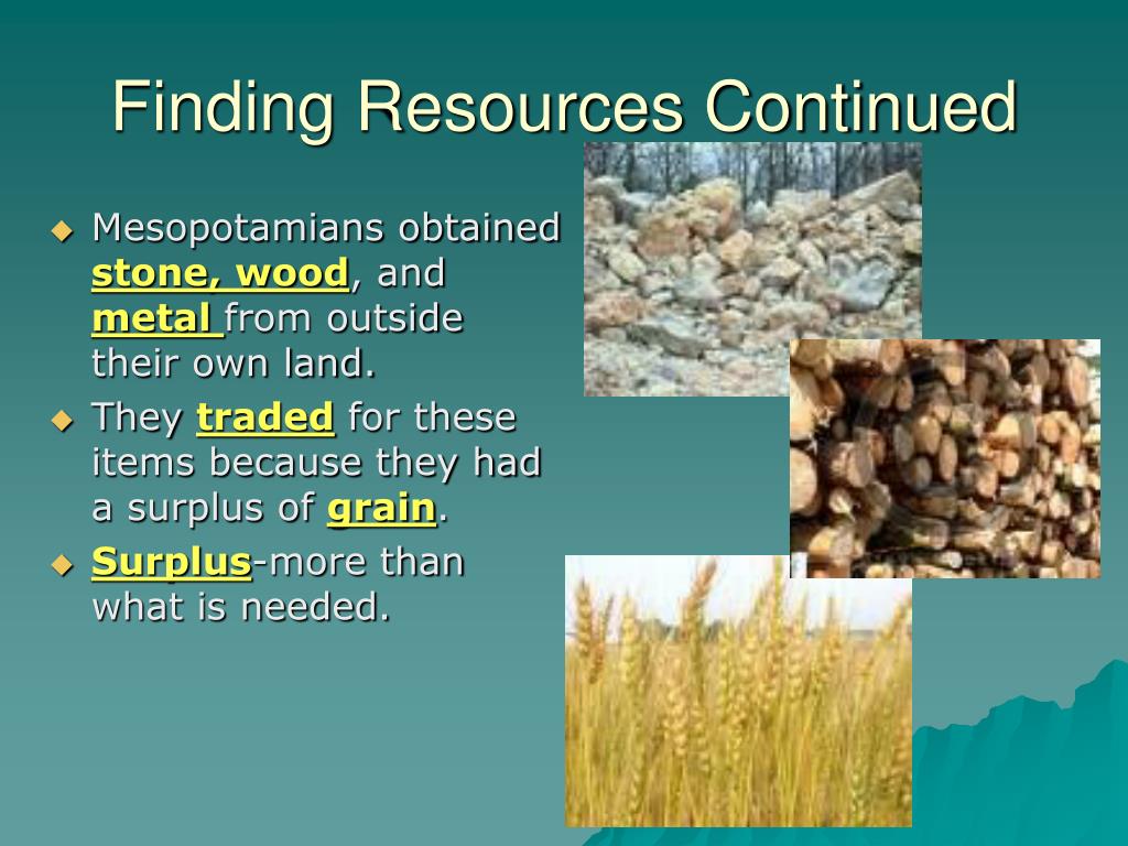 Finding Resources Continued Mesopotamians obtained stone, wood, and metal from outside their own land. They traded for these items because they had a surplus of grain. Surplus-more than what is needed.