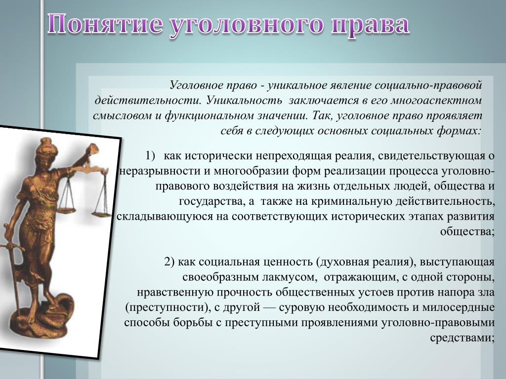 Уголовное право - уникальное явление социально-правовой действительности. Уникальность заключается в его многоаспектном смысловом и функциональном значении. Так, уголовное право проявляет себя в следующих основных социальных формах: как исторически непреходящая реалия, свидетельствующая о неразрывности и многообразии форм реализации процесса уголовно-правового воздействия на жизнь отдельных людей, общества и государства, а также на криминальную действительность, складывающуюся на соответствующих исторических этапах развития общества; 2) как социальная ценность (духовная реалия), выступающая своеобразным лакмусом, отражающим, с одной стороны, нравственную прочность общественных устоев против напора зла (преступности), с другой — суровую необходимость и милосердные способы борьбы с преступными проявлениями уголовно-правовыми средствами; Понятие уголовного права