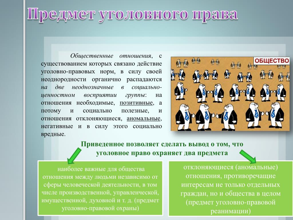 Общественные отношения, с существованием которых связано действие уголовно-правовых норм, в силу своей неоднородности органично распадаются на две неоднозначные в социально-ценностном восприятии группы: на отношения необходимые, позитивные, а потому и социально полезные, и отношения отклоняющиеся, аномальные, негативные и в силуэтого социально вредные. Предмет уголовного права Приведенное позволяет сделать вывод о том, что уголовное право охраняет два предмета наиболее важные для общества отношения между людьми независимо от сферы человеческой деятельности, в том числе производственной, управленческой, имущественной, духовной и т. д. (предмет уголовно-правовой охраны) отклоняющиеся (аномальные) отношения, противоречащие интересам не только отдельных граждан, но и общества в целом (предмет уголовно-правовой реанимации)