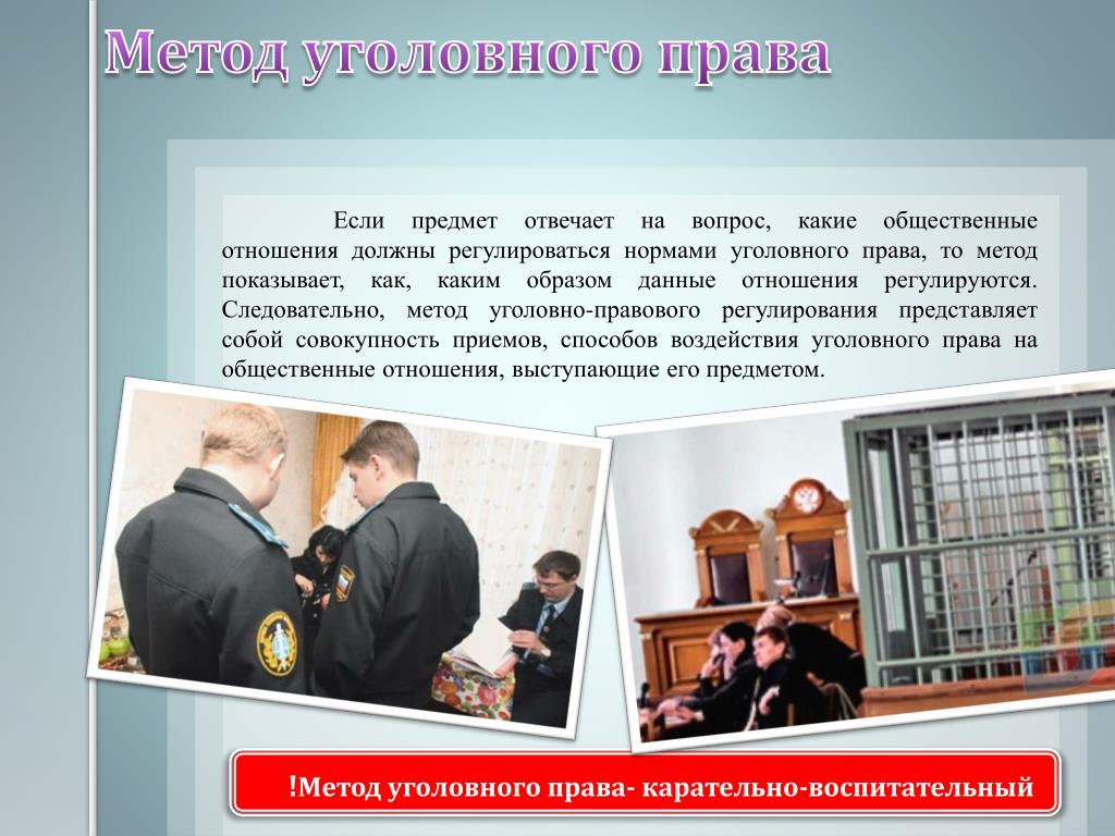 Если предмет отвечает на вопрос, какие общественные отношениядолжны регулироваться нормами уголовного права, то метод показывает, как, каким образом данные отношения регулируются. Следовательно, метод уголовно-правового регулирования представляет собой совокупность приемов, способов воздействия уголовного права на общественные отношения, выступающие его предметом. Метод уголовного права !Метод уголовного права- карательно-воспитательный