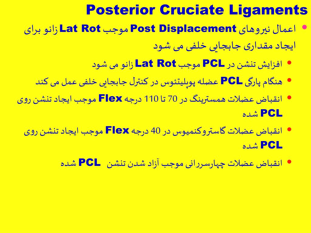Posterior Cruciate Ligaments • اعمال نیروهای Post Displacementموجب Lat Rotزانو برای ایجاد مقداری جابجایی خلفی می شود • افزایش تنشن در PCL موجب Lat Rotزانو می شود • هنگام پارگی PCL عضله پوپلیتئوس در کنترل جابجایی خلفی عمل می کند • انقباض عضلات همسترینگ در 70 تا 110 درجه Flex موجب ایجاد تنشن روی PCL شده • انقباض عضلات گاستروکنمیوس در 40 درجه Flex موجب ایجاد تنشن روی PCL شده • انقباض عضلات چهارسررانی موجب آزاد شدن تنشن PCL شده