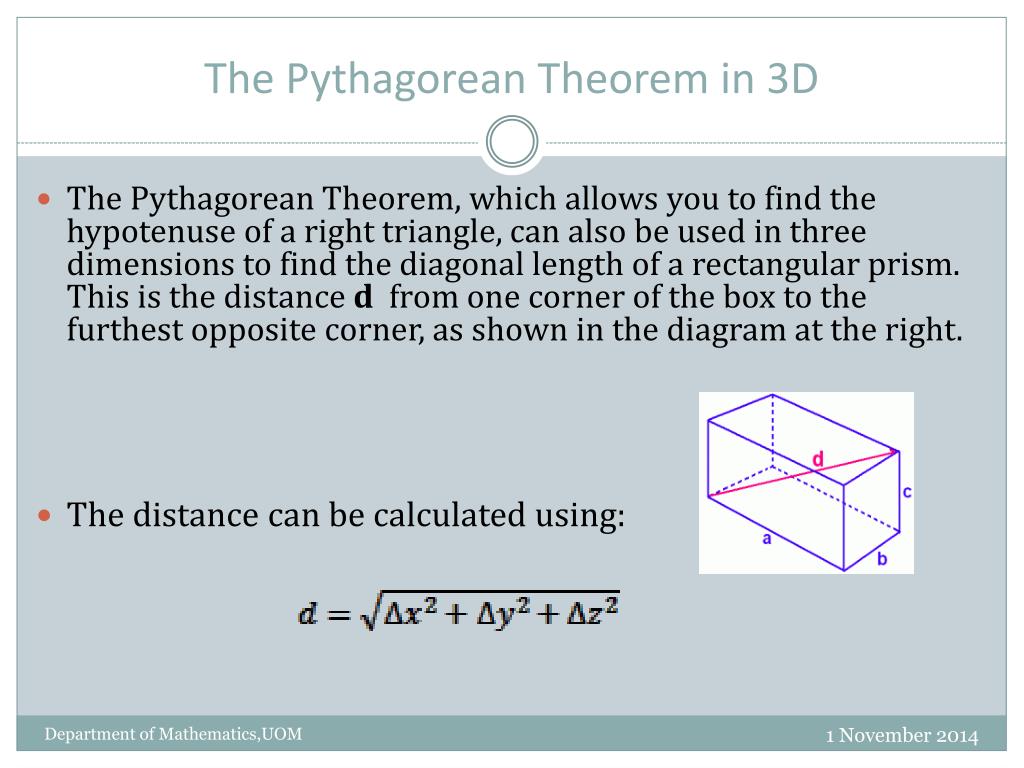 The Pythagorean Theorem in 3D • The Pythagorean Theorem, which allows you to find the hypotenuse of a right triangle, can also be used in three dimensions to find the diagonal length of a rectangular prism. This is the distance d from one corner of the box to the furthest opposite corner, as shown in the diagram at the right. • The distance can be calculated using: Department of Mathematics,UOM