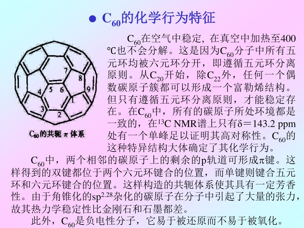 C60的化学行为特征 C60在空气中稳定, 在真空中加热至400 ℃也不会分解。这是因为C60分子中所有五元环均被六元环分开,即遵循五元环分离原则。从C20开始,除C22外,任何一个偶数碳原子簇都可以形成一个富勒烯结构。但只有遵循五元环分离原则,才能稳定存在。在C60中,所有的碳原子所处环境都是一致的,在13C NMR谱上只有δ=143.2 ppm处有一个单峰足以证明其高对称性。C60的这种特异结构大体确定了其化学行为。 C60中,两个相邻的碳原子上的剩余的p轨道可形成键。这样得到的双键都位于两个六元环键合的位置,而单键则键合五元环和六元环键合的位置。这样构造的共轭体系使其具有一定芳香性。由于角锥化的sp2.28杂化的碳原子在分子中引起了大量的张力,故其热力学稳定性比金刚石和石墨都差。 此外,C60是负电性分子,它易于被还原而不易于被氧化。