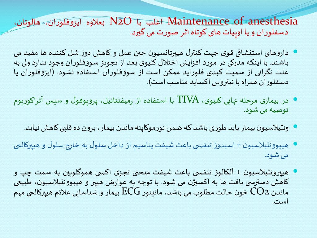 Maintenance of anesthesia اغلب با N2O بعلاوه ایزوفلوران، هالوتان، دسفلوران و یا اوپیات های کوتاه اثر صورت می گیرد. • داروهای استنشاقی قوی جهت کنترل هیپرتانسیون حین عمل و کاهش دوز شل کننده ها مفید می باشند. با اینکه مدرکی در مورد افزایش اختلال کلیوی بعد از تجویز سووفلوران وجود ندارد ولی به علت نگرانی از سمیت کبدی فلوراید ممکن است از سووفلوران استفاده نشود. (ایزوفلوران یا دسفلوران همراه با نیتروس اکساید مناسب است). • در بیماری مرحله نهایی کلیوی، TIVA با استفاده از رمیفنتانیل، پروپوفول و سیس آتراکوریوم توصیه می شود. • ونتیلاسیون بیمار باید طوری باشد که ضمن نورموکاپنه ماندن بیمار، برون ده قلبی کاهش نیابد. • هیپوونتیلاسیون + اسیدوز تنفسی باعث شیفت پتاسیم از داخل سلول به خارج سلول و هیپرکالمی می شود. • هیپرونتیلاسیون + آلکالوز تنفسی باعث شیفت منحنی تجزی اکسی هموگلوبین به سمت چپ و کاهش دسترسی بافت ها به اکسیژن می شود. با توجه به عوارض هیپر و هیپوونتیلاسیون، طبیعی ماندن CO2 خون حالت مطلوب می باشد، مانیتور ECG بیمار و شناسایی علائم هیپرکالمی مهم است.