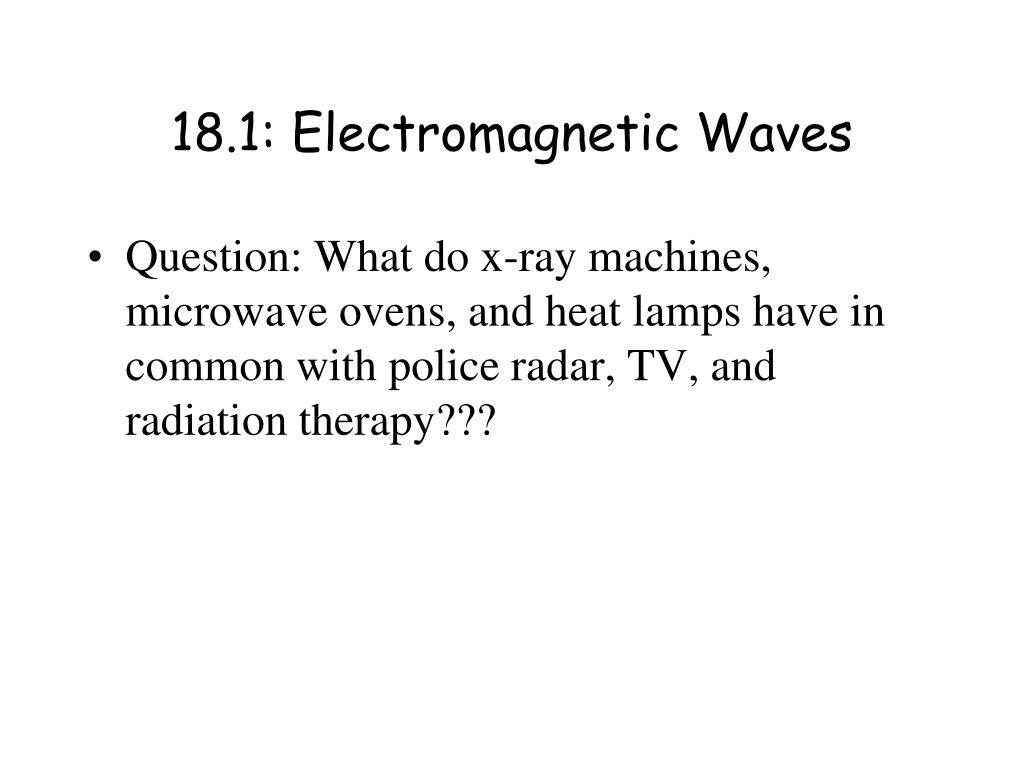 Chapter 18: Electromagnetic Spectrum & Light. 18.1: Electromagnetic Waves. Question: What do x-ray machines, microwave ovens, and heat lamps have in common with police radar, TV, and radiation therapy???. Electromagnetic Waves.