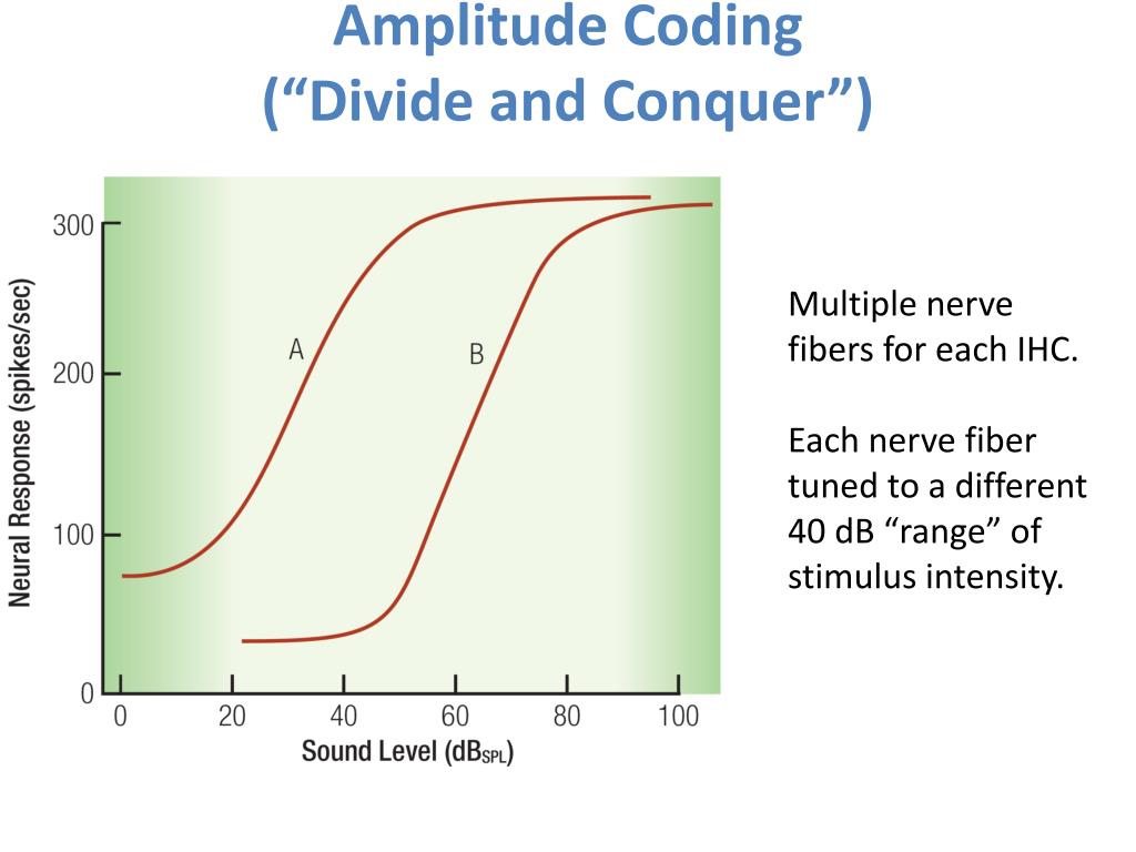 Amplitude Coding(“Divide and Conquer”) Multiple nerve fibers for each IHC. Each nerve fiber tuned to a different 40 dB “range” of stimulus intensity.