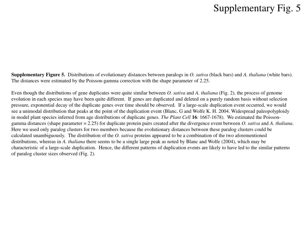 Supplementary Fig. 5 Supplementary Figure 5. Distributions of evolutionary distances between paralogs in O. sativa (black bars) and A. thaliana (white bars). The distances were estimated by the Poisson-gamma correction with the shape parameter of 2.25. Even though the distributions of gene duplicates were quite similar between O. sativa and A. thaliana (Fig. 2), the process of genome evolution in each species may have been quite different. If genes are duplicated and deleted on a purely random basis without selection pressure, exponential decay of the duplicate genes over time should be observed. If a large-scale duplication event occurred, we would see a unimodal distribution that peaks at the point of the duplication event (Blanc, G and Wolfe K. H. 2004. Widespread paleopolyploidy in model plant species inferred from age distributions of duplicate genes. The Plant Cell16: 1667-1678). We estimated the Poisson-gamma distances (shape parameter = 2.25) for duplicate protein pairs created after the divergence event between O. sativa and A. thaliana. Here we used only paralog clusters for two members because the evolutionary distances between these paralog clusters could be calculated unambiguously. The distribution of the O. sativa proteins appeared to be a combination of the two aforementioned distributions, whereas in A. thaliana there seems to be a single large peak as noted by Blanc and Wolfe (2004), which may be characteristic of a large-scale duplication. Hence, the different patterns of duplication events are likely to have led to the similar patterns of paralog cluster sizes observed (Fig. 2).