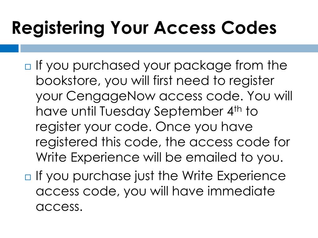 Registering Your Access Codes • If you purchased your package from the bookstore, you will first need to register your CengageNow access code. You will have until Tuesday September 4th to register your code. Once you have registered this code, the access code for Write Experience will be emailed to you. • If you purchase just the Write Experience access code, you will have immediate access.